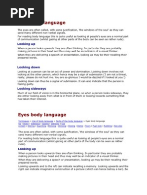 If someone looks down while you are looking at them in the eye then it would typically be a submissive gesture. Get this free guide to find out. Avoid looking up and to the right it s a universal symbol of boredom and dismissal.